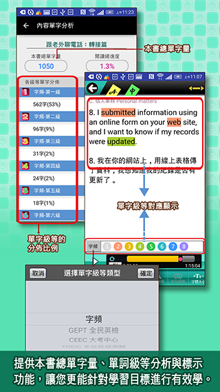 ● 單詞級等標示,您可依學習目標,選擇標示出文章中單詞的級等,級等系統包含有:字頻(8級等)、大考中心(6級等)、全民英檢(3級等)、多益常考用字。一鍵操作,讓您一目了然,可強化單字力學習。